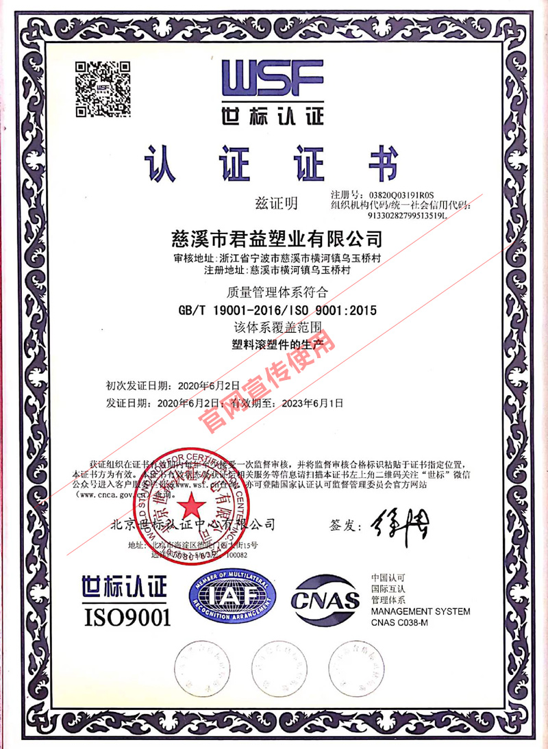 公司通過了ISO9001質(zhì)量管理體系認(rèn)證,嚴(yán)格遵循GB9687-88質(zhì)量標(biāo)準(zhǔn)生產(chǎn),產(chǎn)品經(jīng)國家塑料制品質(zhì)量監(jiān)督中心檢驗合格,經(jīng)浙江省產(chǎn)品質(zhì)量監(jiān)督所和浙江省衛(wèi)生廳檢測合格達(dá)標(biāo)認(rèn)可, 并擁有世標(biāo)認(rèn)證和3項專利證書。